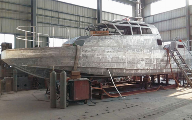 13米消音三體船船體及上建材料;鋁合金總長:13.47米 型寬:3.84米 型深:1.58米 航速:39 節(jié)